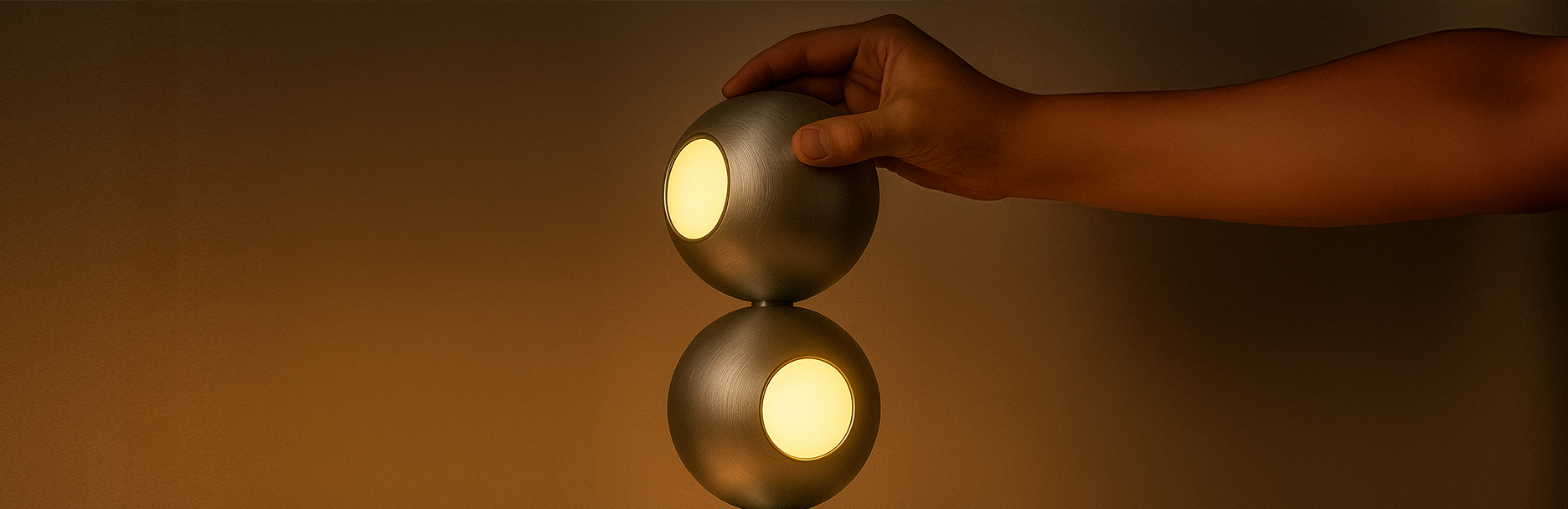 Echoes of Sun is a tactile lighting object with rotating orbs inspired by the compass, exploring how the sun connects the distant places I call home.