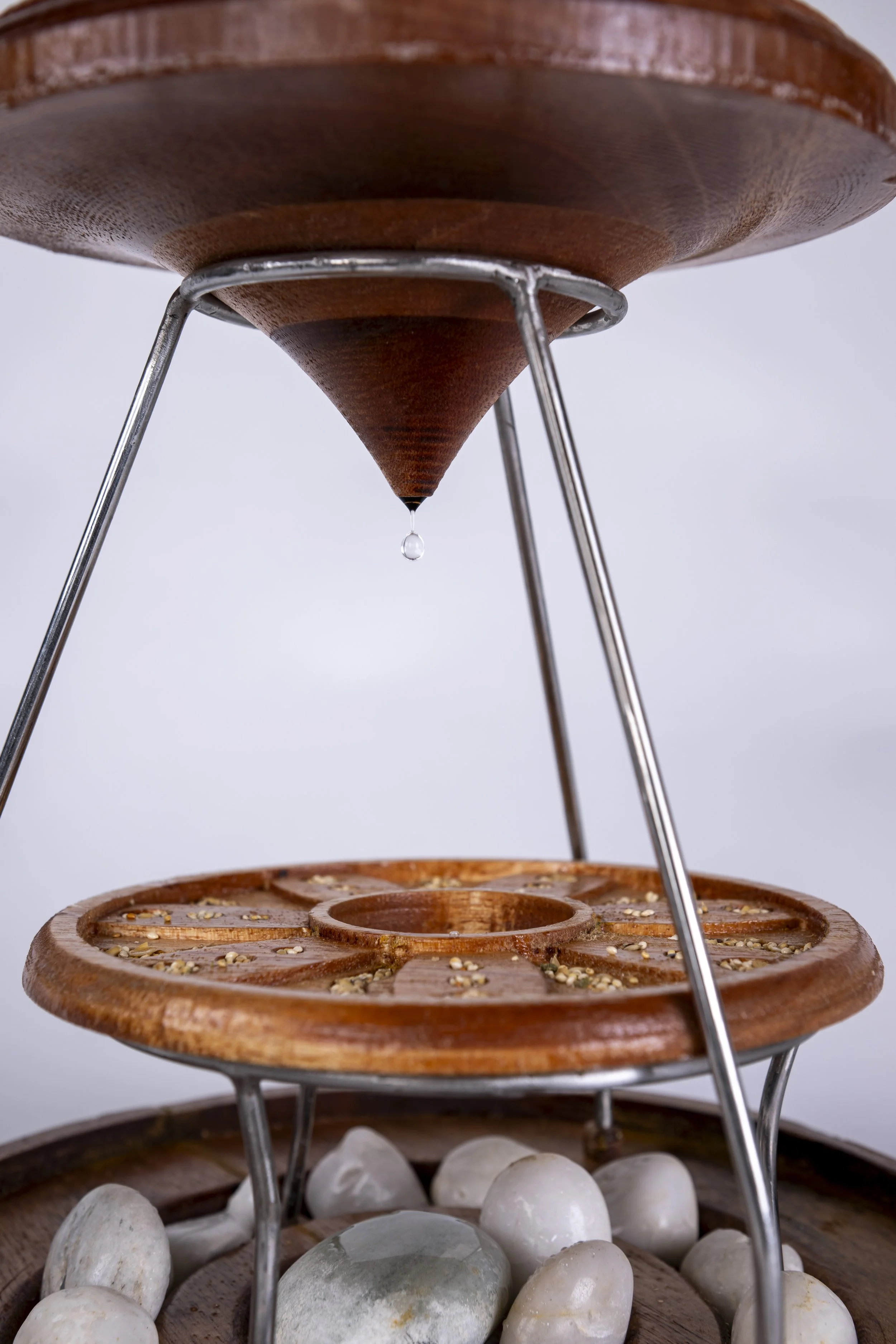 Constructed from CNC-milled wood and precisely bent metal, NestScape combines steel, wood, and stone for both strength and tactility. The slow-drip feature is integrated into the top element, engineered to let water pass through gradually. Digital fabrication and careful assembly ensure a durable, refined structure that brings a touch of nature’s calm into city spaces.