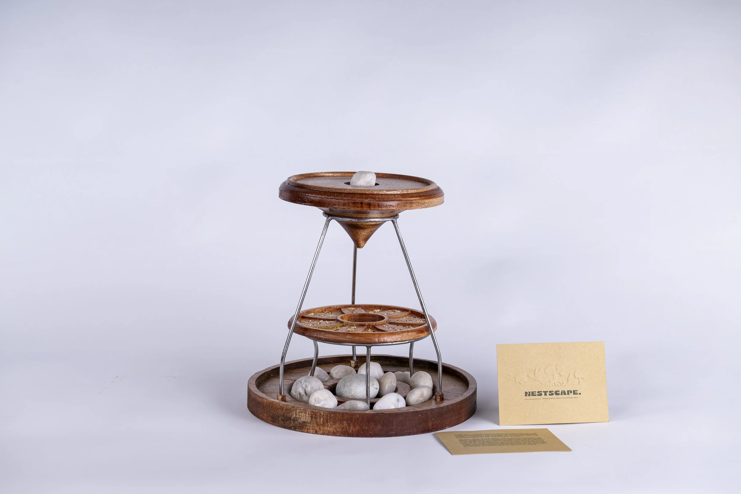NestScape is inspired by childhood memories of birdwatching in the mangroves of Al Khor, translating moments of quiet observation into a sculptural urban bird feeder. Three vertical pillars echo the rhythm of mangrove roots, supporting spaces for water and food. The top piece is specially designed to release water slowly, creating gentle droplets that attract birds and invite them to pause, bridging natural rituals with urban life.